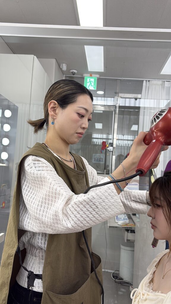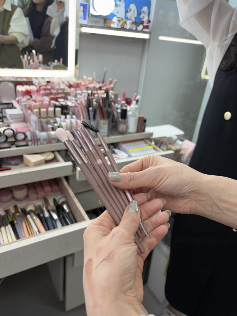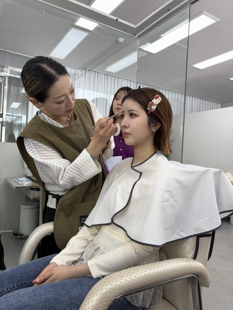 韓国ならではのデイリーメイクからK-POPアイドルメイクまで、二日間にわたりしっかり学ぶことができました。午前中はデモンストレーション、午後からの実習では技術をしっかり教えていただきました。スキンケアから使う色、ベースの作り方まで、今までに学んできた事とは違い、とても刺激的な時間となりました。練習では、つけまつ毛の付け方、スポンジでの圧や密着のさせ方、一つ一つの工程が繊細でかなり苦戦しました。